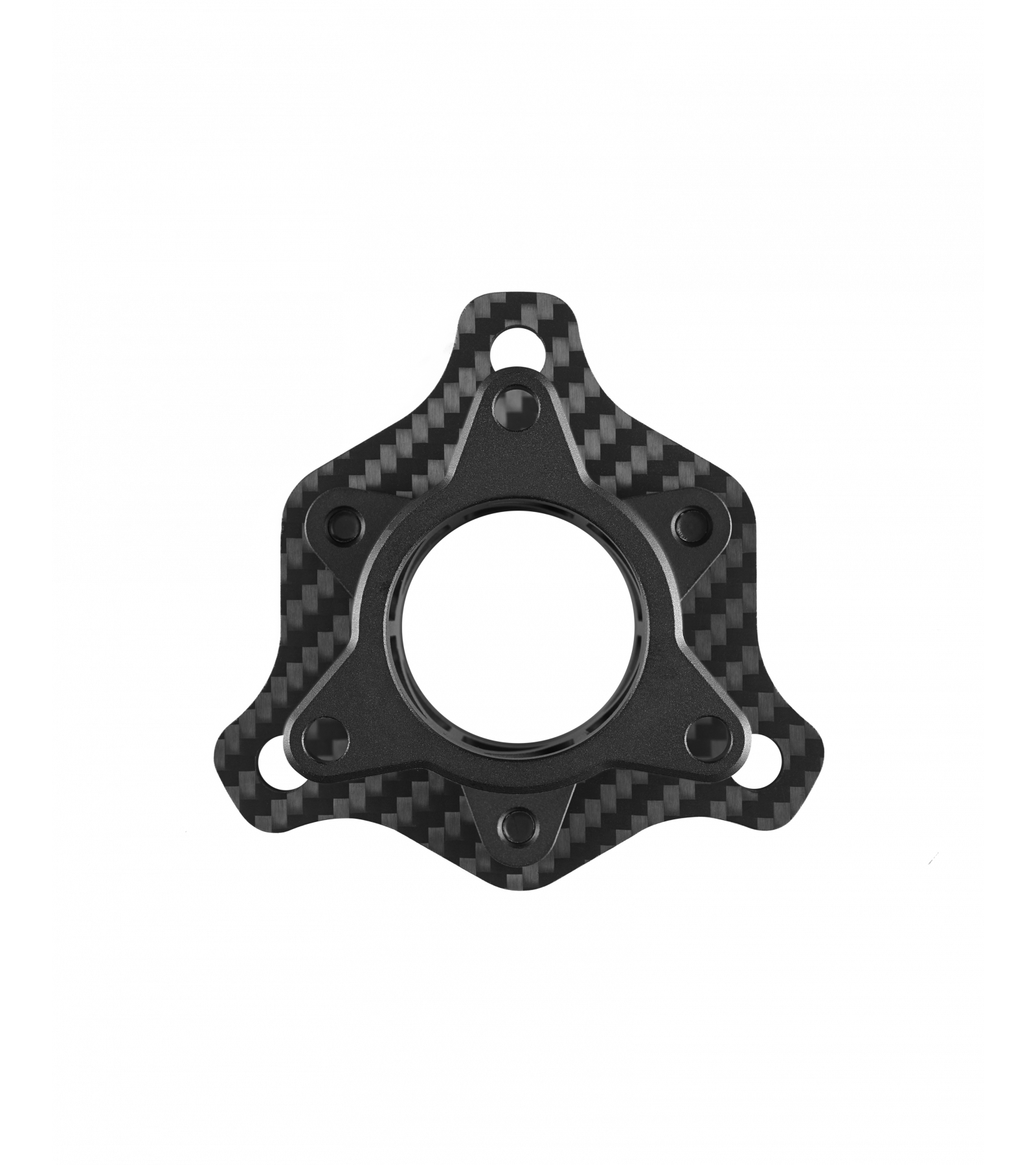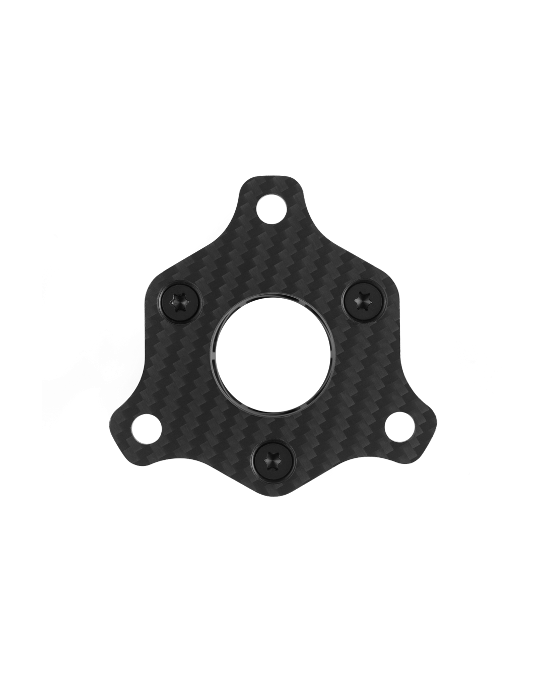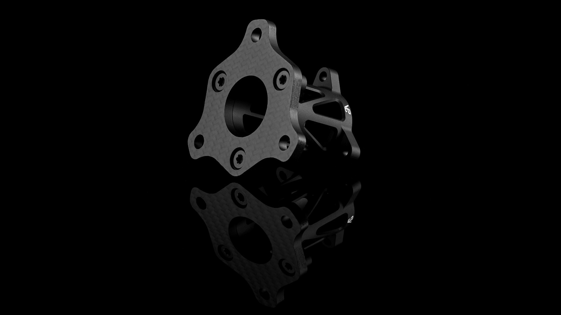 The Spacer is built to be simple to fit and widely compatible: Back mount — 50.8 mm hole pattern to bolt directly to the rear of any compatible wheel. Face mount — 50.8 mm M5 threaded hole pattern to accept wheels, quick releases, and adapters. Carbon‑fibre adapter — Supplied with a 6 mm carbon fibre plate; use this with 70 mm PCD quick releases for a secure, lightweight interface.Installation is intentionally straightforward — the Spacer’s chamfers and countersinks make alignment and bolt insertion fast, even when working in tight cockpit spaces. For ease of installation, the face and back mounting patterns are rotated relative to each other. This ensures easy access to the fixings, even when the wheel and quick release are installed, allowing for quick assembly and maintenance in tight spaces.